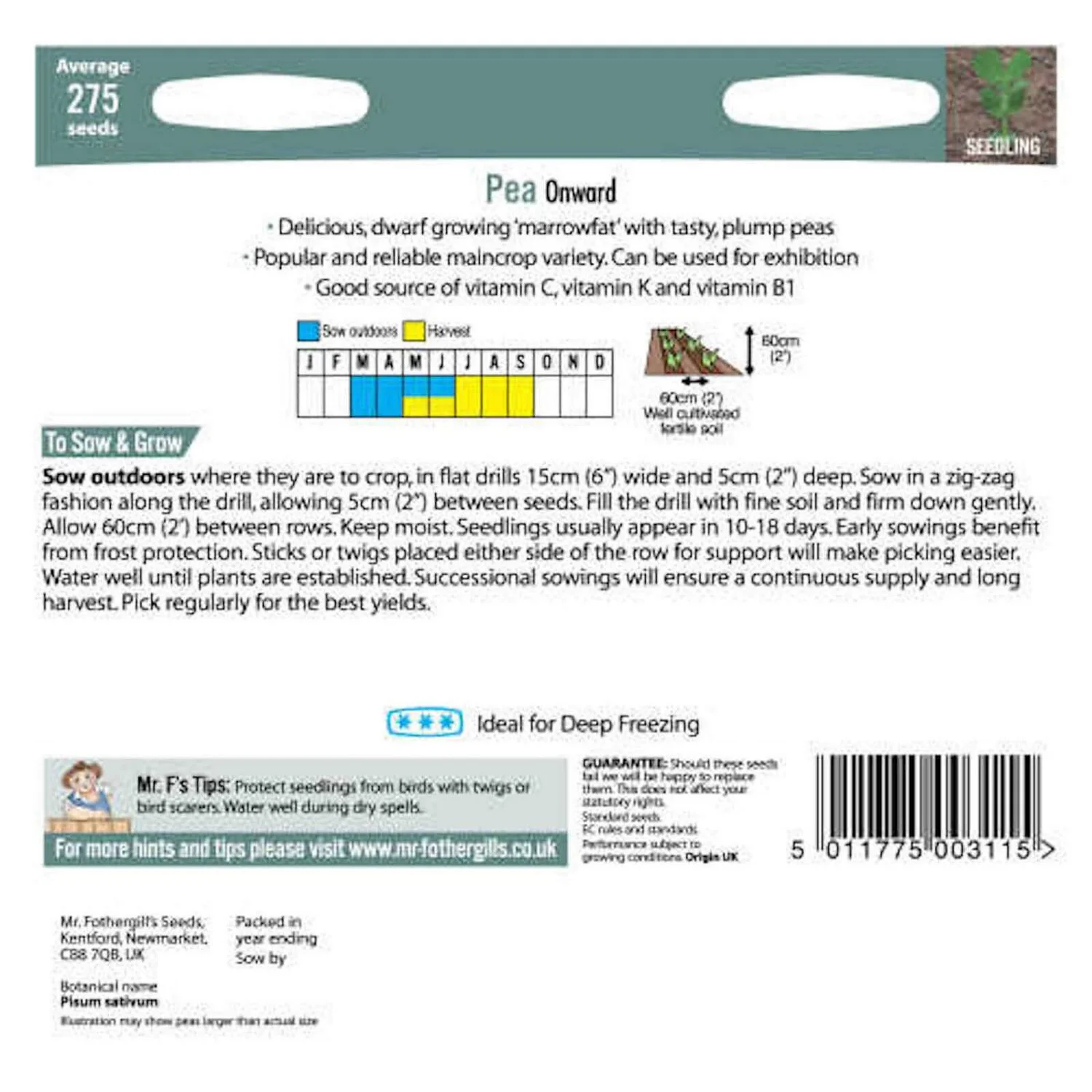 Pea Onward (Pisum sativum) is a favourite maincrop marrowfat variety producing very tasty plump peas on dwarf plants.