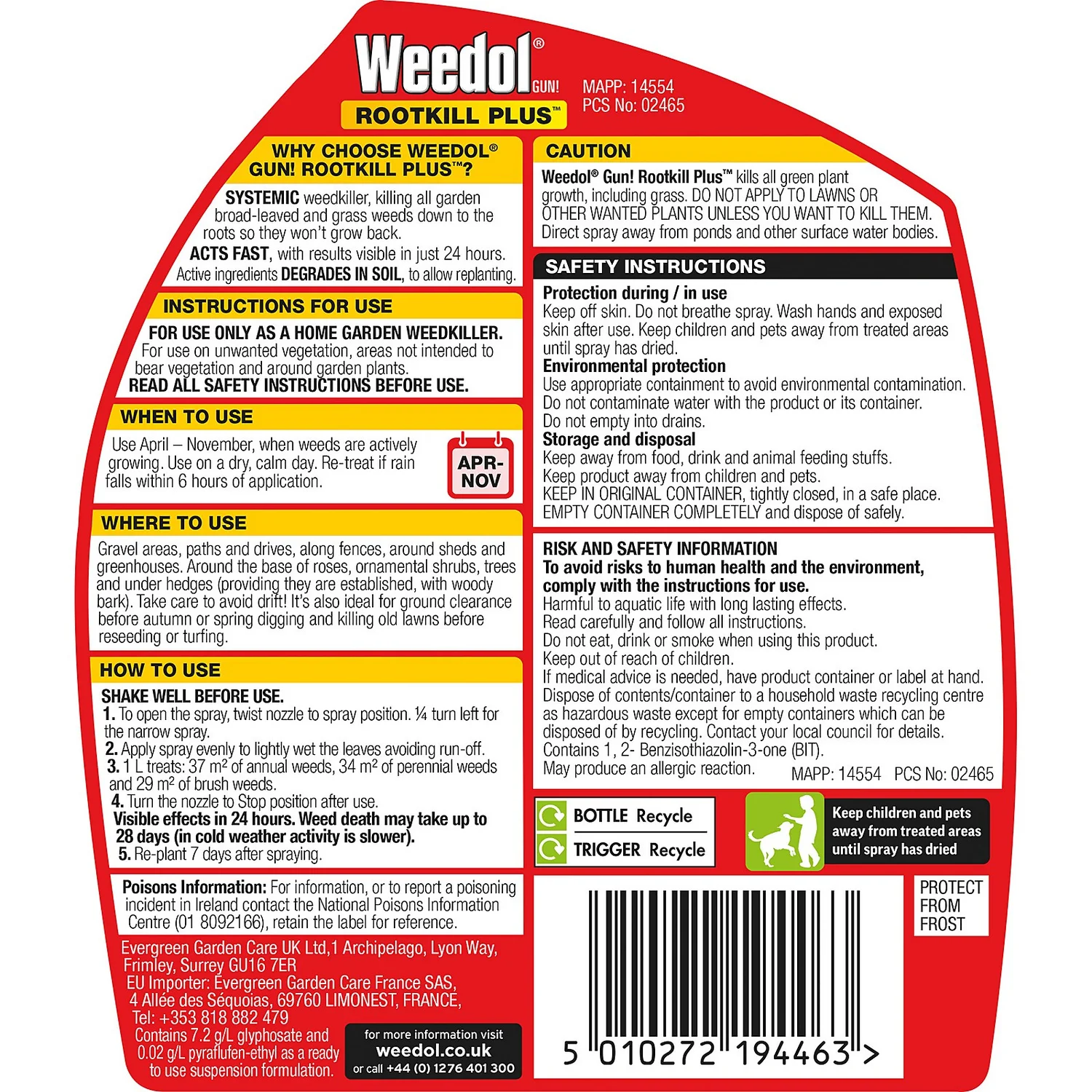 | Safety Information | Contains glyphosate and diflufenican. Use weed killer products safely. Always read the label and product information before use. |